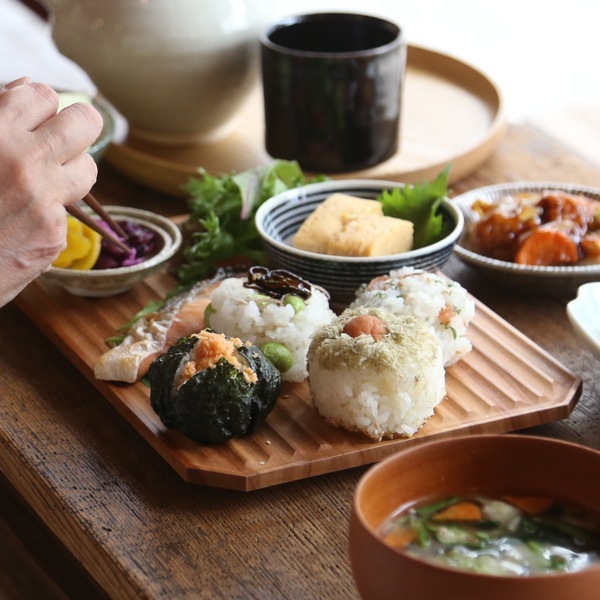 おにぎりや和食にも重宝します。溝の間隔が狭いので、豆皿など置いてもぐらつくことがなくぴたっと止まり安定。