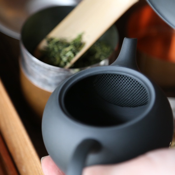 【丸急須 後手 烏泥】 陶板に細かな穴を空けて取り付けらた内部の茶漉し部分は、しっかりと茶葉を漉しながらも目詰まりしにくく、最後の一滴まで注ぎきることができます。