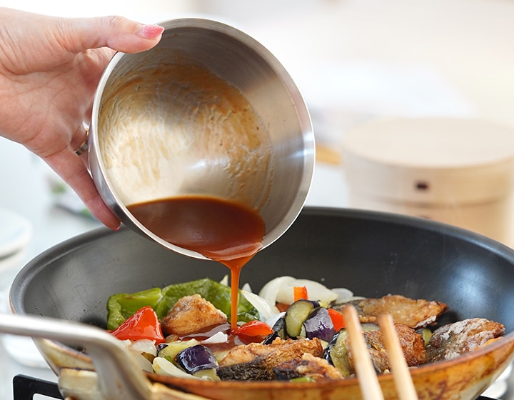 丸バットで蓋をして冷蔵庫へ 別売りのまかないシリーズの丸バットや平ザルと併せて使うことで、さらに料理の下ごしらえが捗ります。