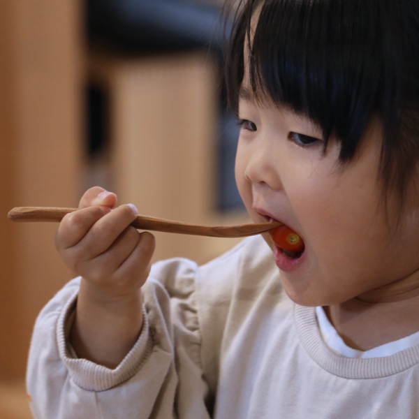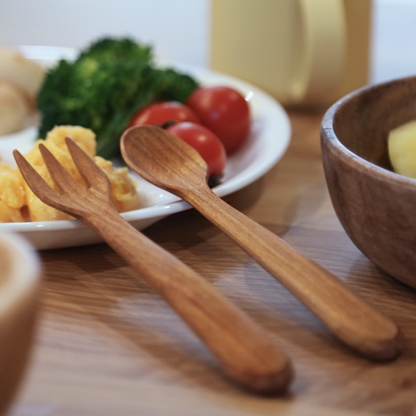 フォークの先端が尖っていないので、お口周りを傷つける心配がなく、お子様やご高齢の方にも安心です。ガチャガチャと音がしないのも木のスプーンのいいところ。