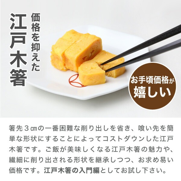 お手頃箸 - 定番箸の先の削り出しを省いて簡単な形状にし、コストダウンしたお箸。
