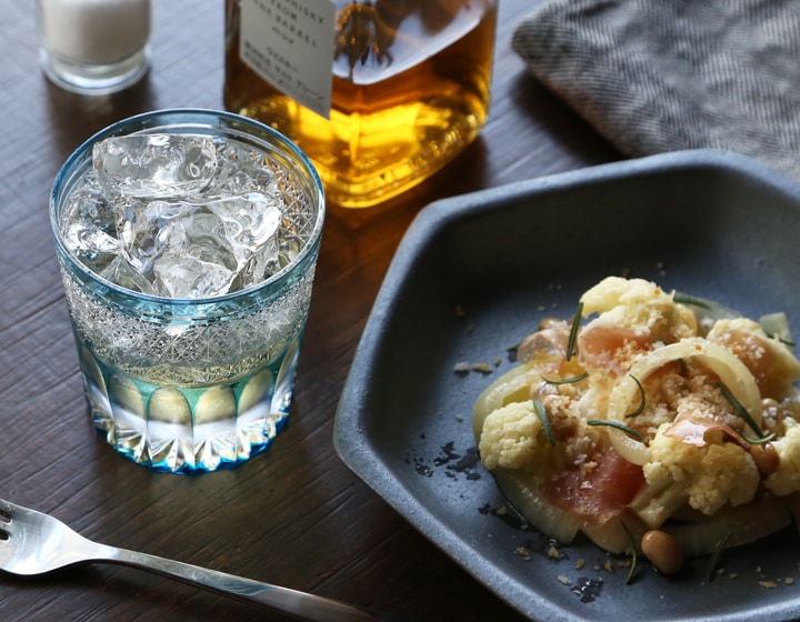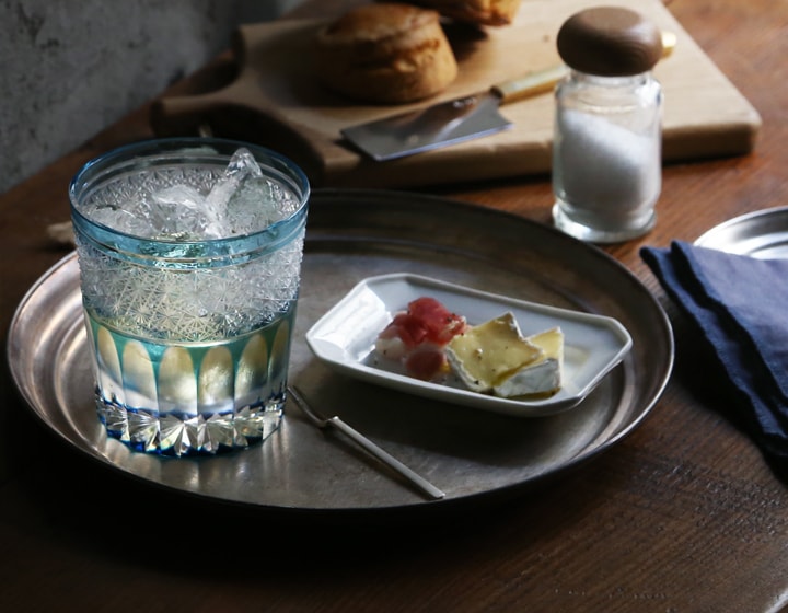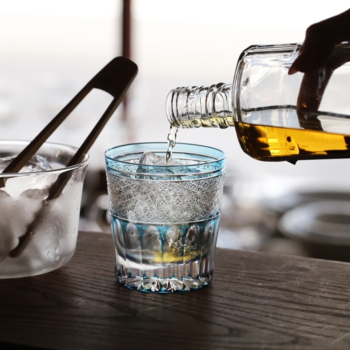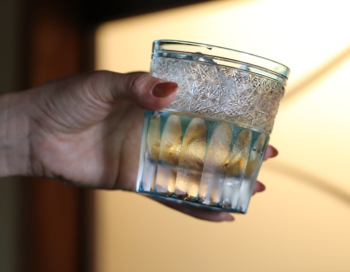 修行を重ね、江戸時代から受け継がれた技術を駆使して作られる裕二氏の作品は、素材にもこだわった繊細で正確なカットや独特の文様が特徴。ロックグラス 水色(門脇硝子×ガランドウ)