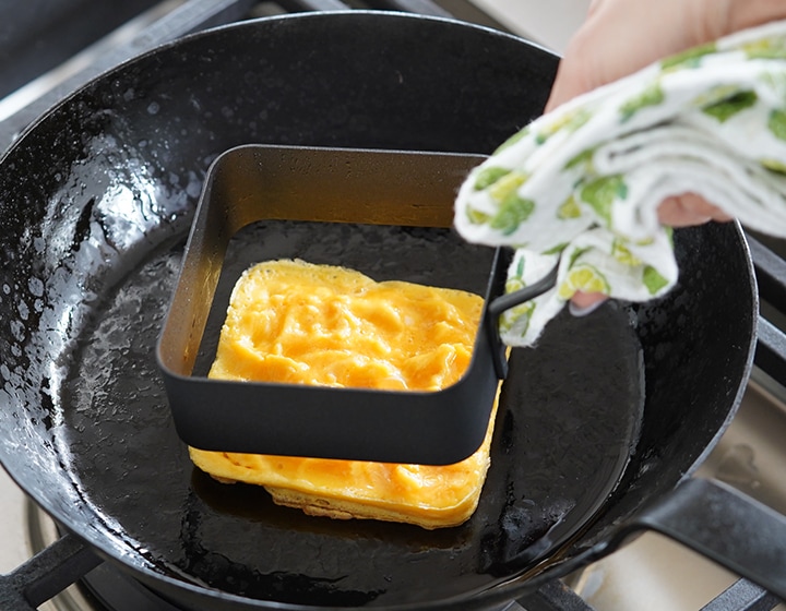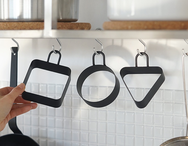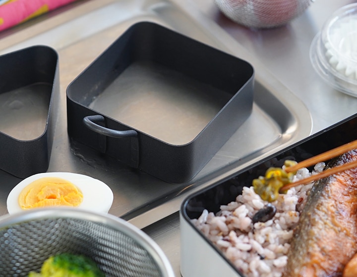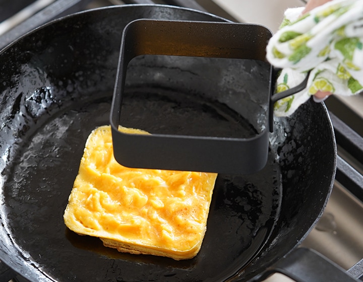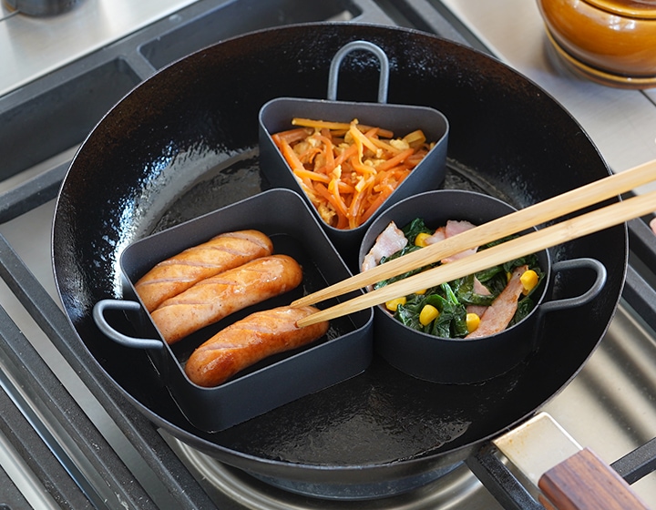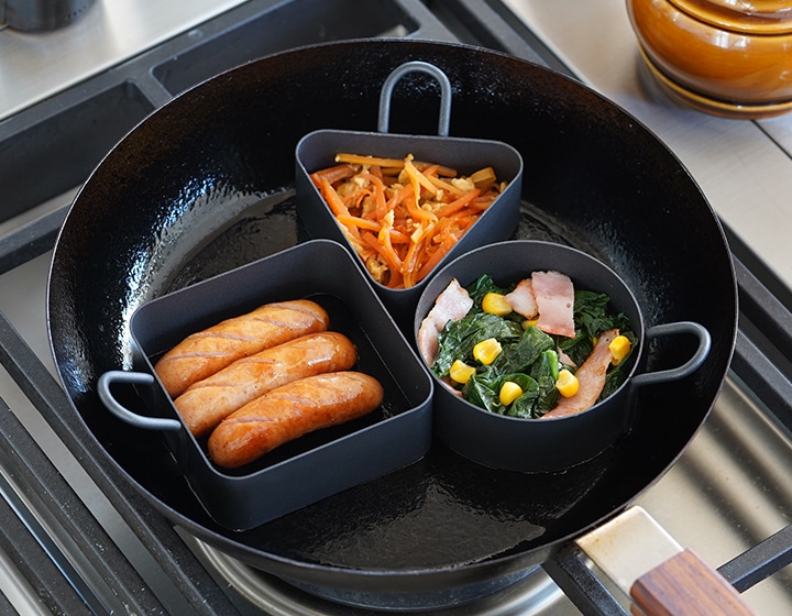 ひとつのフライパンで2種類以上のおかずが調理できる便利なリング。朝食のワンプレートやお弁当に詰めるおかずを一度に調理することができます。