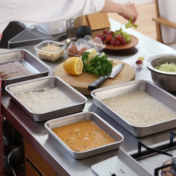 エビフライやとんかつなどの小麦粉、溶き卵、パン粉付けに。適度な深さがあるので、こぼれにくく気を張らずに衣がつけられます。