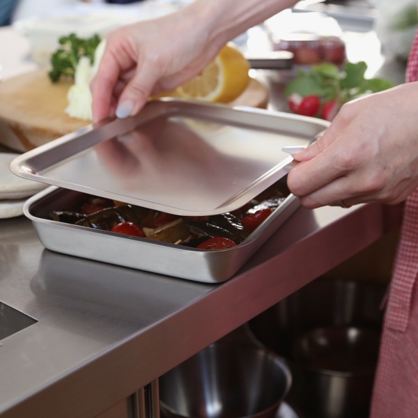カット野菜や、角バットで漬け込んだマリネなど、ラップ代わりにトレーをのせてそのまま冷蔵庫に。積み重ねることができるので、冷蔵庫の中もすっきり、有効活用できます。