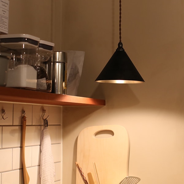 無垢の真鍮にお歯黒を刷毛で擦り込んだペンダントランプ「円錐 削り出し 黒ムラ」