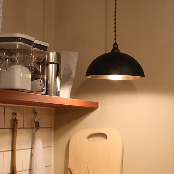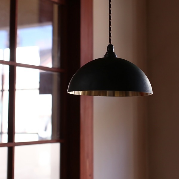 無垢の真鍮にお歯黒を刷毛で擦り込んだペンダントランプ「半球 削り出し 黒ムラ」