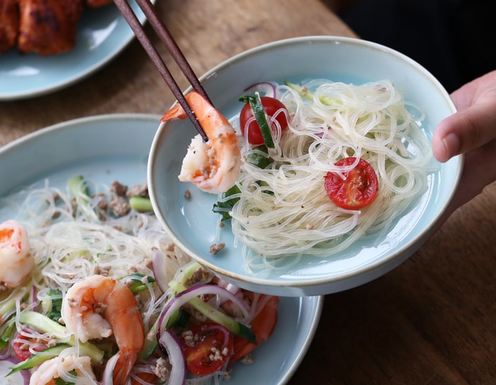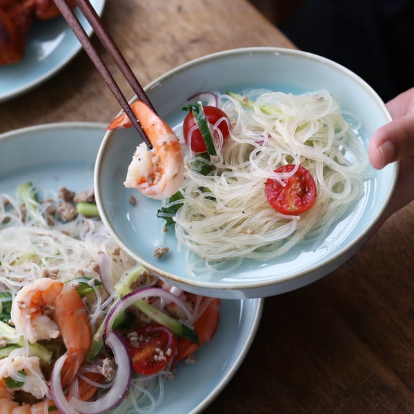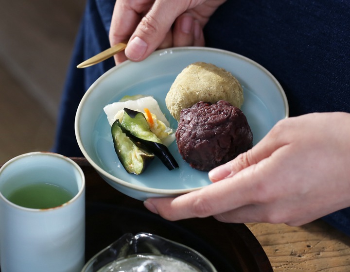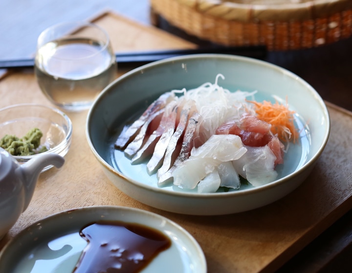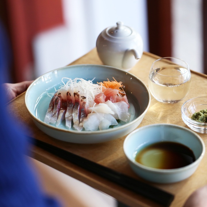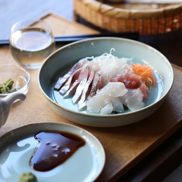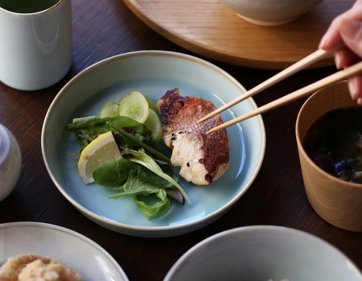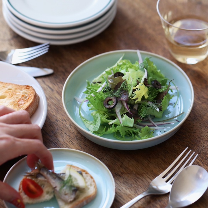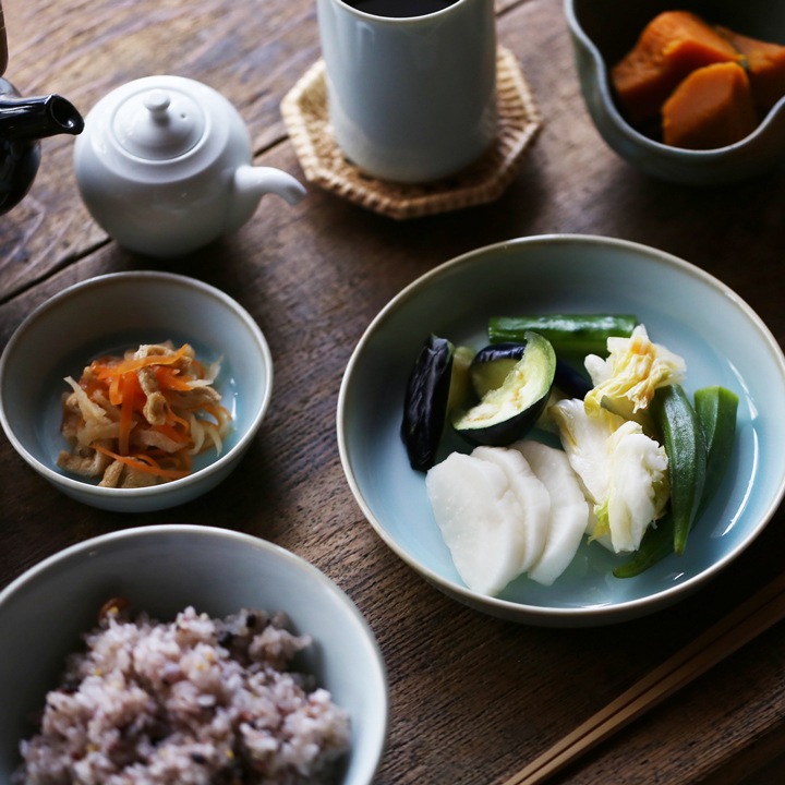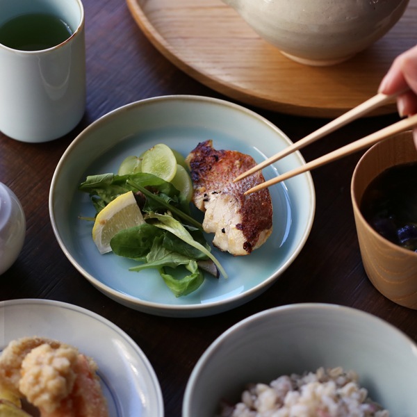 お料理を引き立たたせ、上品に見せてくれる「青白磁シリーズ」は、お皿3サイズ、平鉢3サイズ、茶碗、丼、湯呑の全部で9種類。淡い水面のような器に食材の色味がよく映えます。食卓を彩る気品のある青の器