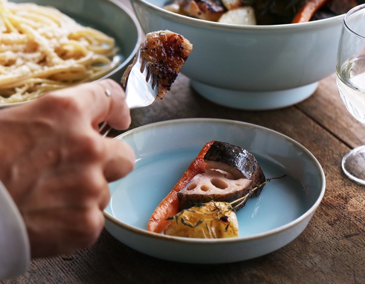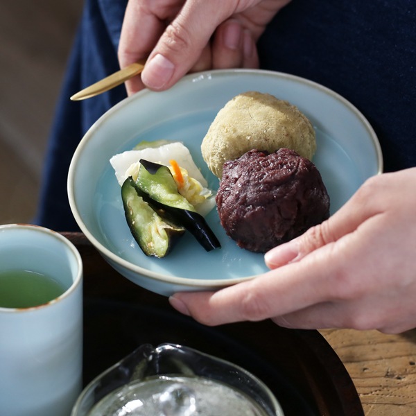 釉薬の溜まりによる色の濃淡、うっすらと錆が巻かれた縁周りが柔らかな雰囲気。艶やかで爽やかな水色がお料理を引き立てくれ、気持ちまで明るくなりそうです。食材が引き立つ青白磁シリーズ