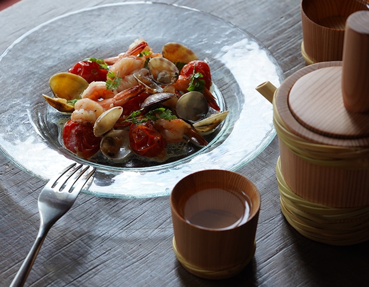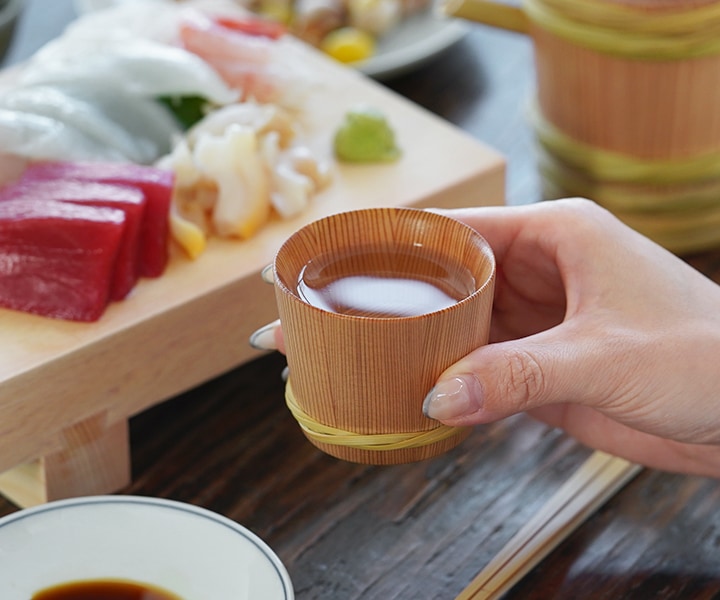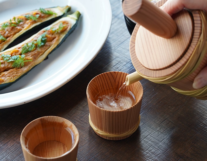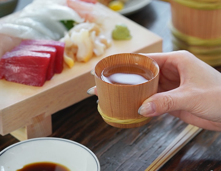 お酒を注ぐとほんのりと杉の香りが広がり、口元に運ぶと木の質感の柔らかさが感じられます。日本酒と杉の木の清々しい香りがほのかに合わさり、まろやかで口当たりのよい美味しいお酒になり、まるで樽酒のような味わいの日本酒を楽しむことが出来ます。