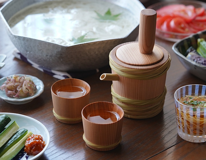 天然杉を使用し、桶作りの技法で組み上げられた小さな酒樽と桶のような風情漂う酒器セット。