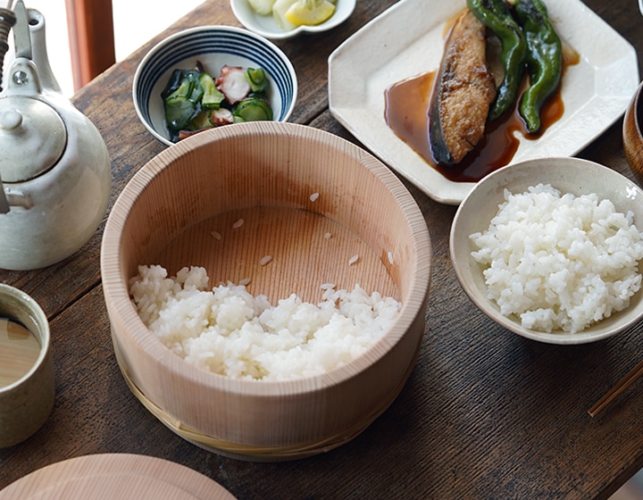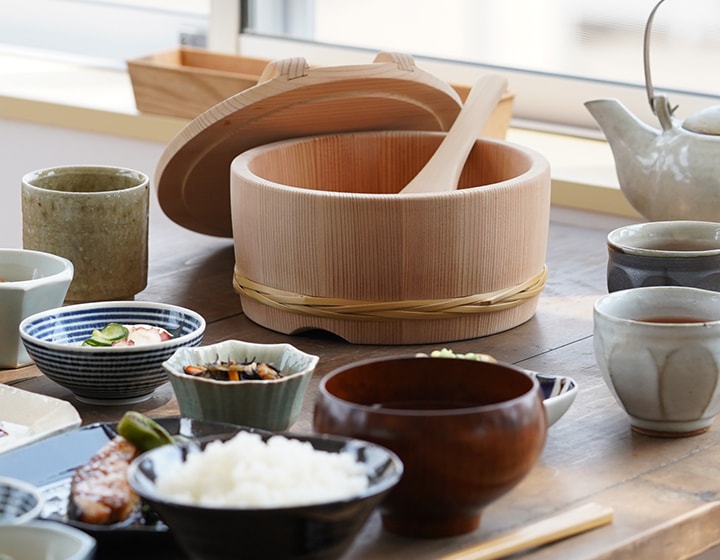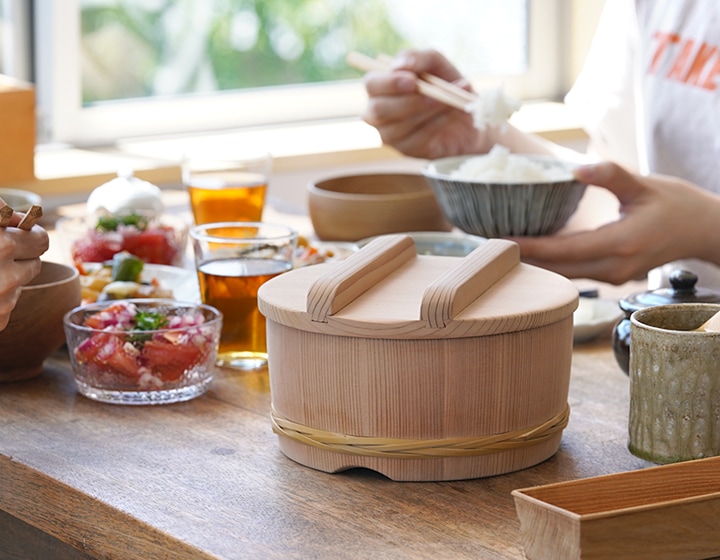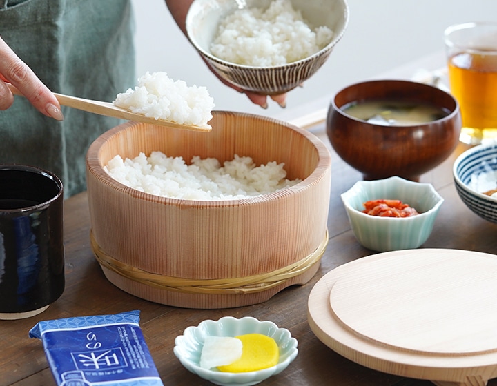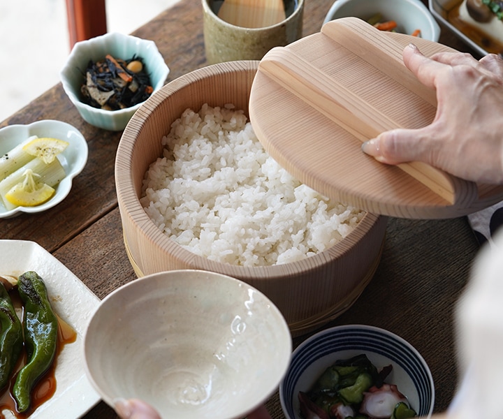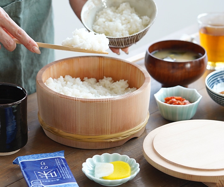 おひつは炊きたてご飯の余分な水分を吸収してくれ、ふっくらとツヤのある美味しいご飯に仕上げてくれる昔ながらの食卓の道具です。