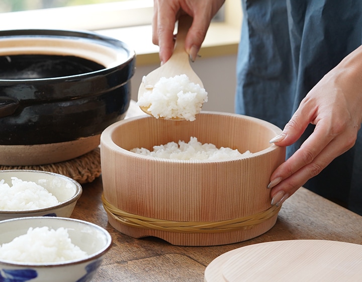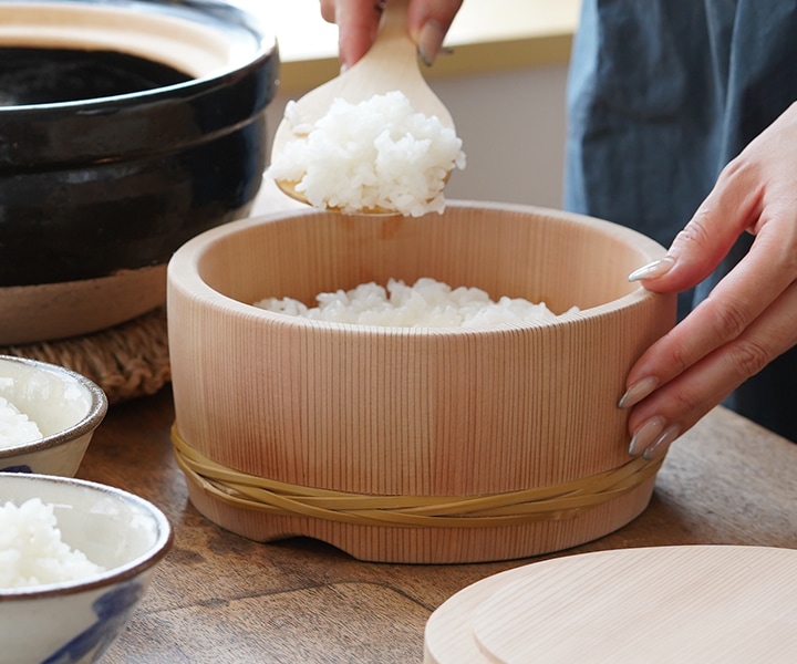 浅型おひつ3合 蒸らしが終わった直後の炊き立てご飯をおひつに移す。この一手間で、おひつが美味しいご飯に仕上げてくれます。