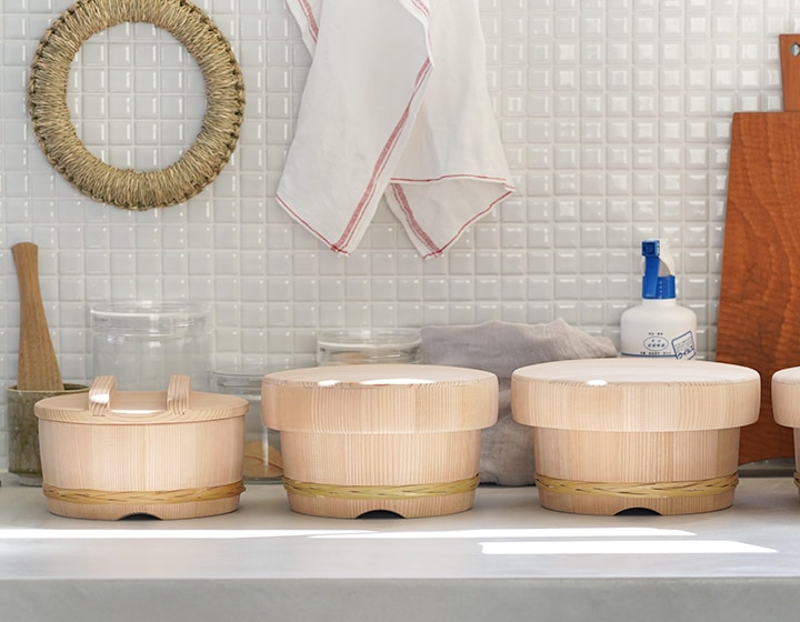 食卓がちゃぶ台だった頃、おひつは床の上で使用していたため深さがありました。テーブルと椅子に代わった現代の生活様式に合わせるよう作られた日樽のおひつは、使いやすく現代の食卓によく馴染みます。