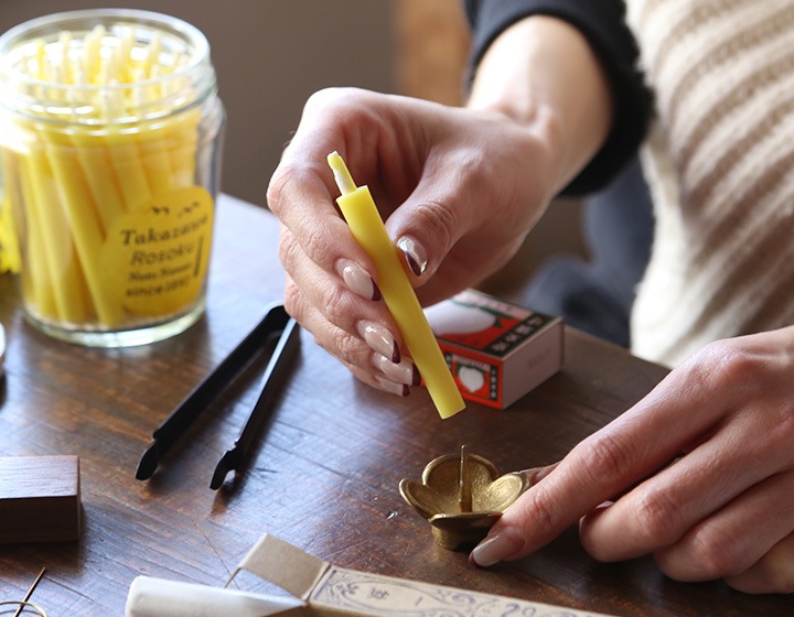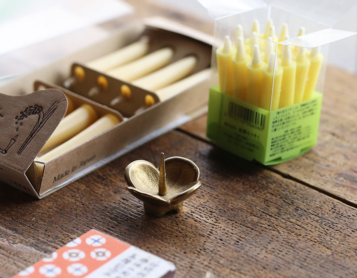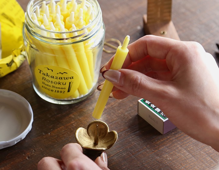 燭台は小さいながらも存在感のある真鍮製。小さめのお仏壇にも置きやすく、コンパクトにお使いいただけます。燭台は着色を施していないため、使い続けるうちに深みのある色合いになり、少しずつ育つ様子を楽しめます。高澤ろうそく 菜の花ろうそく トモーレ 1号 30本入り