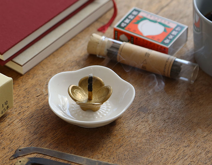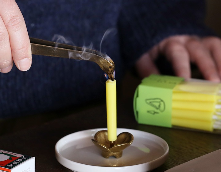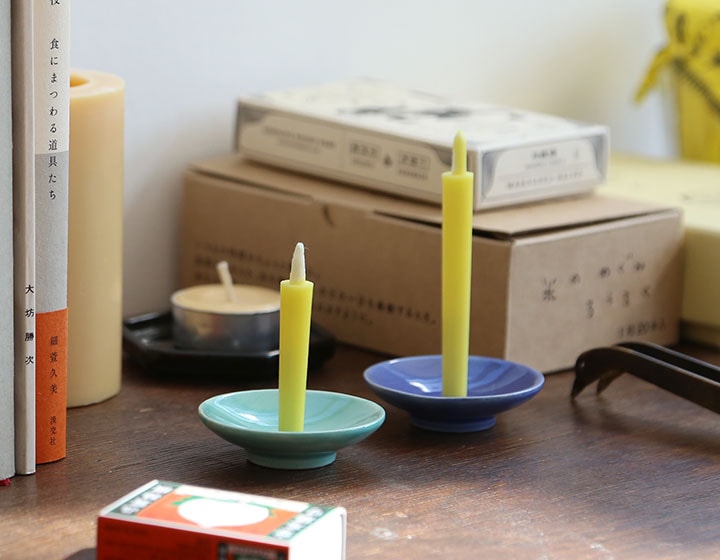 ついつい息を吹きかけたり、手で仰いだりして消そうとすると、ロウが飛び散ったり、誤って燭台を倒してしまうことも。和ろうそくの火を安全に消すときは、なるべく芯切りばさみを使うことをおすすめします。ちいさくてかわいい菜の花の燭台