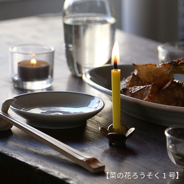 高澤ろうそくと、富山県高岡市にある能作が、菜の花ろうそくに合わせて作ったなのはな燭台に立てて灯すのもかわいいです。