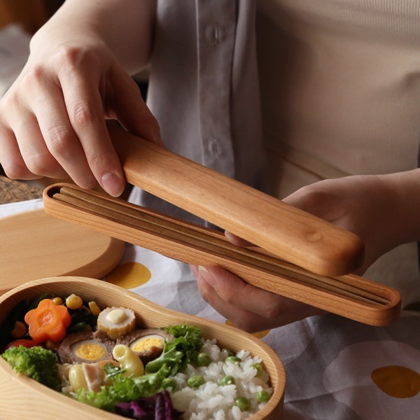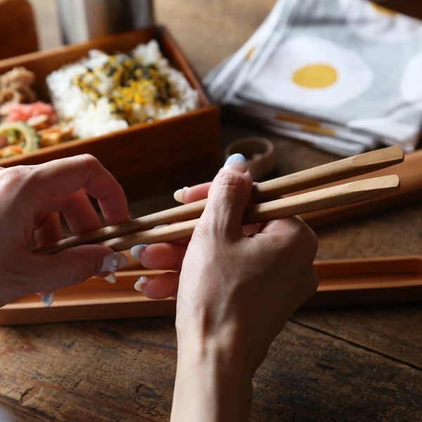 フタは、開け閉め・出し入れがしやすいかぶせ蓋で、同サイズのめいぼく箸がぴったりと収まります。曲げわっぱや木製のお弁当箱に良く似合います。
