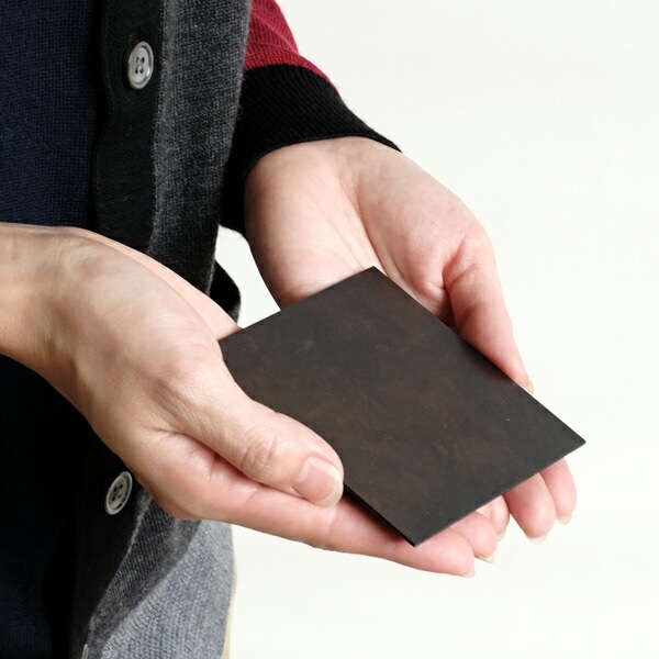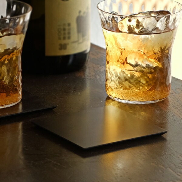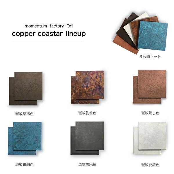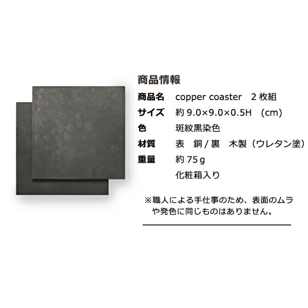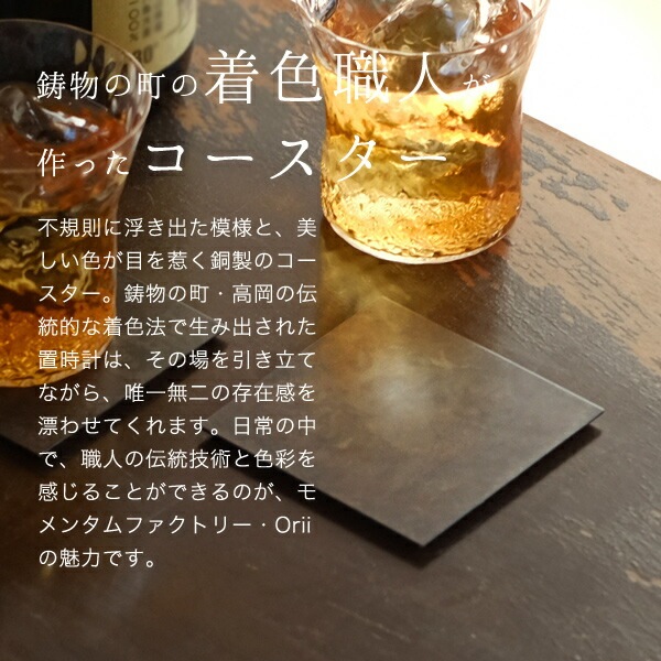 - 高岡で製作した美しい銅器着色が特徴のコースターのご紹介です。金属と漆の町、高岡で製作されたこのコースターは古来より伝わる伝統的な着色を独自に進化させ、昔ながらの手作業で丁寧に色付けしてあります。その着色法はとても面白く、糠味噌や酢、漆などを用い、煮たり焼いたり、浸したりとまるで料理をするかのごとく行われます。何度も何度も工程を繰り返してつけられる色は、塗料を付着させてものではなく、素材の色を変化させ美しさを引き出したもので、とても奥深い色合いになっています。裏面は木製で塗りが施されており、掴みやすい形状に仕上げられています。日本らしい色合いにシンプルなデザインがとても素敵なコースター2枚組ですよ。贈り物にもぜひお使い下さいね。