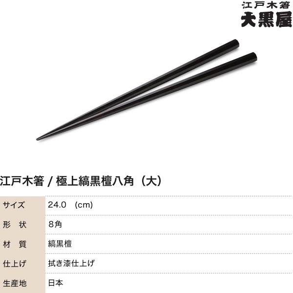 大黒屋 / 極上縞黒檀 八角 大 サイズ 24cm 重さ 約24g 形状 八角 材質 縞黒檀 生産 Made in Japan ※サイズ、重さには個体差があります 大黒屋の江戸木箸