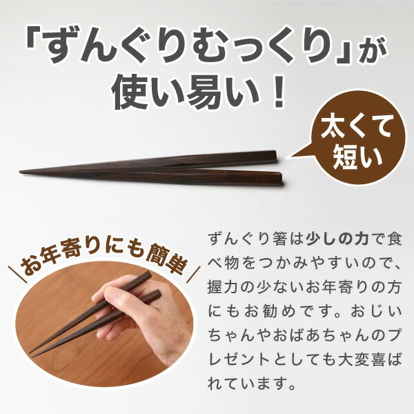- 普段何気なく使っている「箸」。江戸木箸はその「箸」を「命を運ぶ道具」として徹底的にこだわり、どのような方の手にもピッタリ使いやすいよう、さまざまな形状を製作しています。ずんぐり箸は持ち手が太く、長さが短い形状で、握力の弱い方でも使いやすいようにと考えられており、箸先に力が伝わりやすく作られています。その製作法はまさしく「神業」といえるもので、竹田氏は定規や治具などを一切使わず、目と体で覚えた感覚のみで材料を箸の形状に削りだしていきます。又、縞黒檀という硬く、加工しにくい材料を使って製作するのは細く強い箸先を作る為で、口に食材を運んだときの繊細な感覚は誰もがきっと驚いてしまうはずです。ずんぐり箸は握力の弱いお年寄りの方や、長い箸を持つのが苦手な方、又短いので外出用やアウトドアにもオススメですよ。一度、江戸木箸を使ってみて下さい。きっと他の箸はもう使えませんよ。 / サイズ:約1.0×1.0×18.5(cm) / 形状:5角 / 素材:縞黒檀 / 拭き漆仕上げ