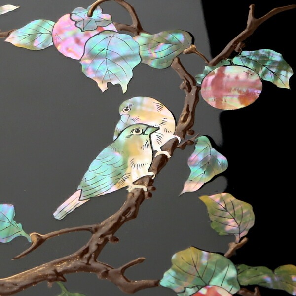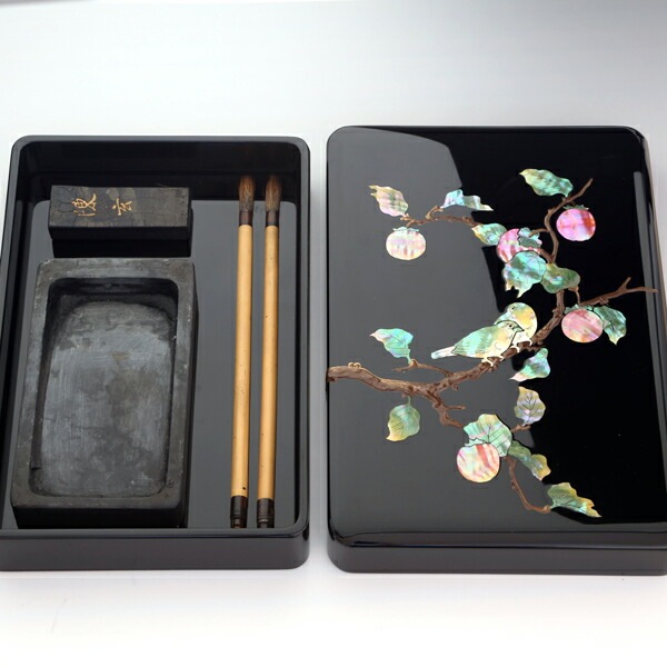 硯箱 螺鈿(らでん) 柿に目白5.5寸