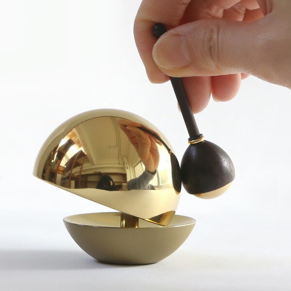 おりんサイズ:約5.4φ×5.3H(cm) / りん棒サイズ:約2.0φ×6.7H(cm) / 座布団サイズ:約9.0×7.6×0.8H(cm) / 素材:おりん(真鍮)りん棒(木製真鍮)座布団(ポリエステル) / 2005-2006グッドデザイン:賞受賞 / 化粧箱入