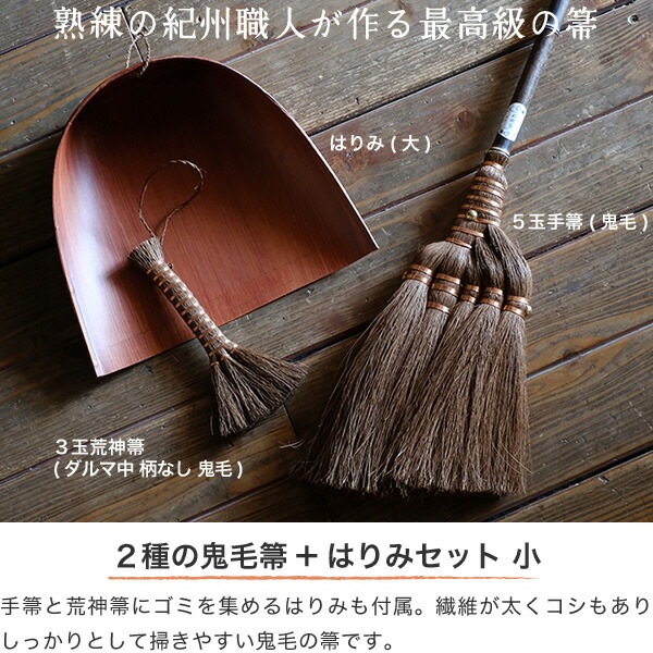 - 古くから日本人の生活に欠かせなかった和箒。数百年の歴史があるといわれている伝統的な棕櫚箒は、自然素材:でありながら丈夫で長持ち。原料の棕櫚の皮の繊維は細く弾力があってしなやかで、畳やフローリングなど様々な素材:に安心して使用できます。しっかりとした密度と厚みのある穂先で撫でるように掃けば、埃を舞い上がらせる事無く塵や埃を逃さずキャッチ。また、繊維に含まれる油脂が、掃けば掃くほど床材の自然の艶を引き出し天然のワックス効果もあります。使いやすさにこだわり、熟練の紀州職人がひとつひとつ丁寧な手作業で作る最高級の棕櫚箒は使い続けるごとに愛着が増します。鬼毛の手箒と荒神箒、ゴミを集めるはりみも付属:した贅沢なセットです。鬼毛のコシが心地よく畳の目にフィットし、特に和室多い家に最適です。セット内容:5玉手箒(最高級鬼毛巻き)/3玉荒神箒(ダルマ中柄なし鬼毛)/はりみ(大)