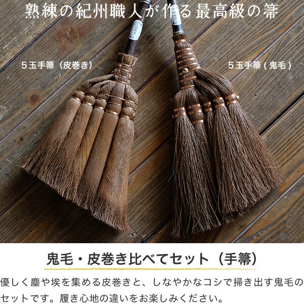 - 古くから日本人の生活に欠かせなかった和箒。数百年の歴史があるといわれている伝統的な棕櫚箒は、自然素材:でありながら丈夫で長持ち。原料の棕櫚の皮の繊維は細く弾力があってしなやかで、畳やフローリングなど様々な素材:に安心して使用できます。しっかりとした密度と厚みのある穂先で撫でるように掃けば、埃を舞い上がらせる事無く塵や埃を逃さずキャッチ。また、繊維に含まれる油脂が、掃けば掃くほど床材の自然の艶を引き出し天然のワックス効果もあります。使いやすさにこだわり、熟練の紀州職人がひとつひとつ丁寧な手作業で作る最高級の棕櫚箒は使い続けるごとに愛着が増します。狭い場所の掃き掃除におすすめの手箒の鬼毛と皮巻きのセットです。鬼毛・皮巻きそれぞれの掃き心地の違いを楽しみながら掃除をすることができます。セット内容:5玉手箒(最高級鬼毛巻き)/5玉手箒