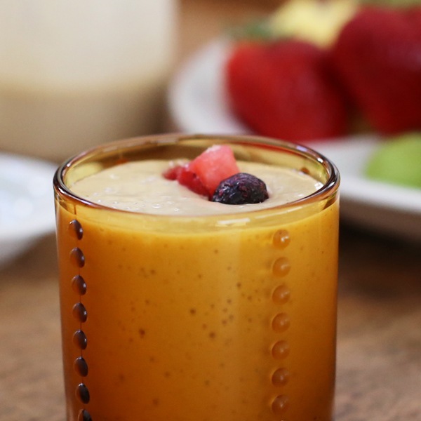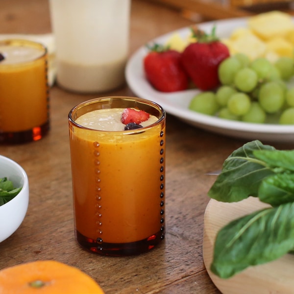 市販のジュースではなく、ぜひジューサーで皮ごと絞った果肉たっぷりのオレンジジュースがおすすめ。果肉も一緒にひと口ずつ味わいながらいただくと、果物の美味しさを堪能できます。