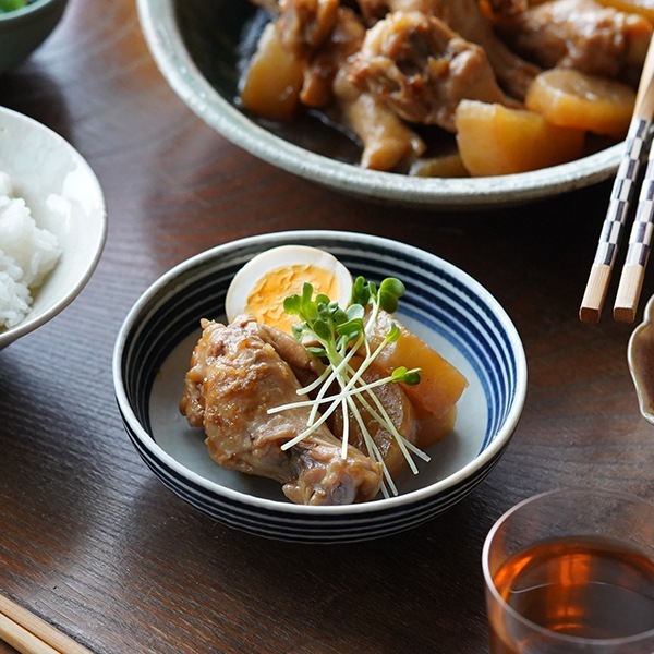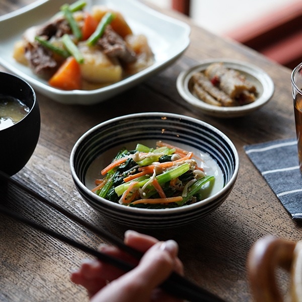 落ち着いた色合いのボーダー柄は、和食・洋食を問わずどんな料理にも合い、他の器とのコーディネートも楽しめます。