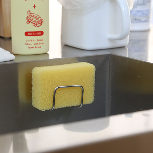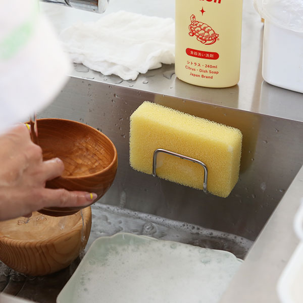 スポンジを取り出すときに吸盤が外れたり、ホルダー部分が左右に回らない仕様。スポンジに接する部分が少なく済み、汚れが溜まりにくいから清潔に使えます。亀の子束子西尾商店 亀の子スポンジ