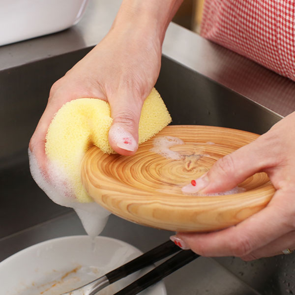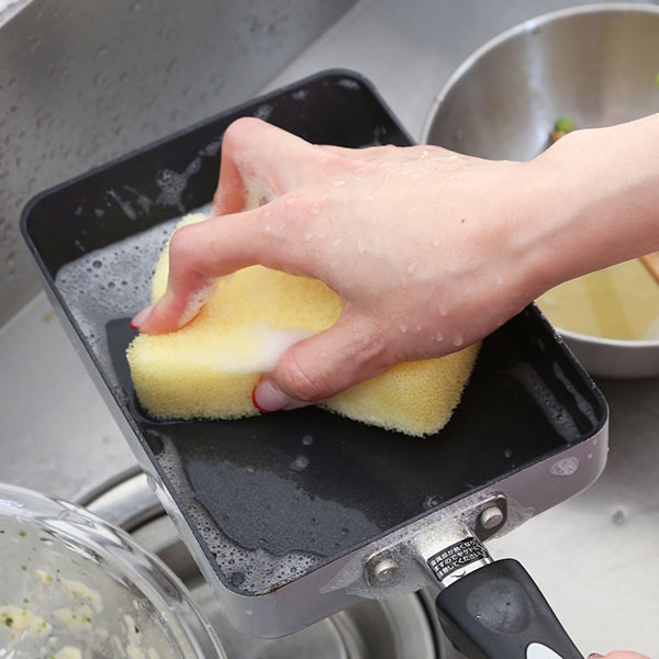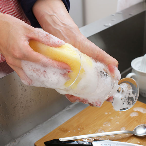 やわらかい亀の子スポンジは目が粗いため泡立ちが良く、少量の洗剤で、もこもこと泡ができあがります。中に残った洗剤も数回揉みこめばすっきりなくなり、水切りもスムーズです。