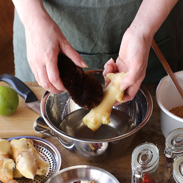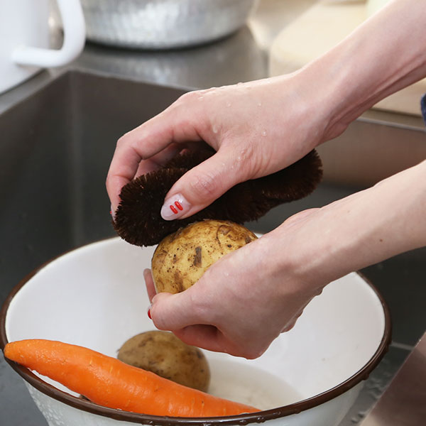 新じゃが、新生姜の薄皮取りに 泥がついた根野菜の洗浄に。硬いパーム束子ほど皮を取ることはできませんが、細い繊維が隙間に入った泥を掻き出してくれます。