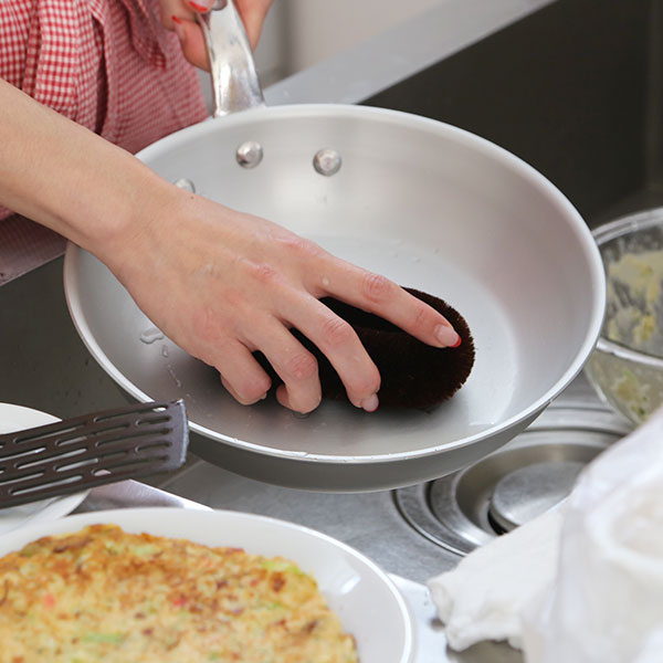 頑固過ぎる焦げつきがあれば、落としやすくするためにフライパンにお湯を張りふやかします。ガシガシと洗いたくなりますが、束子の繊維を寝かしてしまうとかえって洗いにくくなってしまいます。繊維を立てるように力を入れすぎず、円を描くように擦って洗ってみてください。材質について