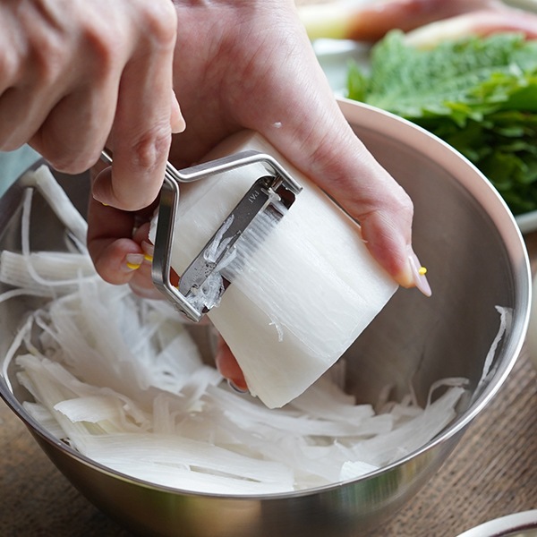 大根と薬味のサラダ 包丁だとなかなか切りづらい細さと長さの千切りも、あっという間に完成する「細千切りピーラー」。 幅が約1mmなので、生野菜のふわふわシャキシャキの歯ごたえを楽しむことができます。 サラダはもちろん、刺身のツマや野菜麺などちょっと凝った料理にも活躍し、料理の幅をグンと広げてくれる一本です。