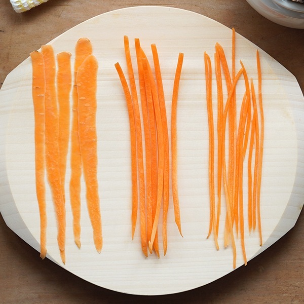 左から、「皮むきピーラー」、「千切りピーラー」、「細千切りピーラー」を使用 ピーラーは、皮むき、千切り、細千切りの3種類があります。にんじんをカットしてみたところ、皮むきは約1cm、千切りは約3mm、細千切りは約1mmの幅になりました。
