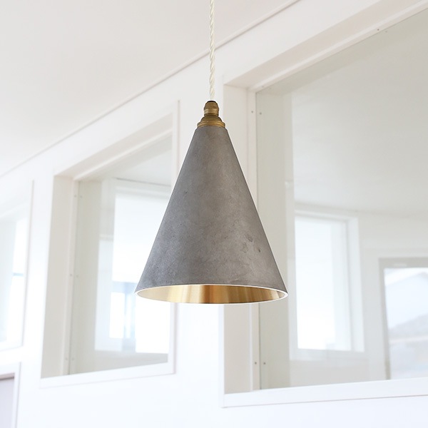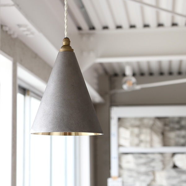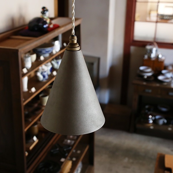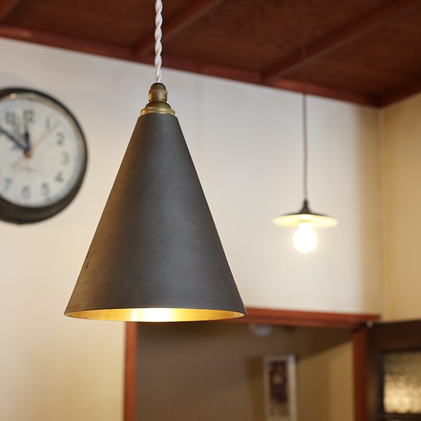 FUTAGAMIの真鍮製品は、型から取り出したままの鋳物の表面「鋳肌」をあえてそのままの風合いで残し、真鍮素材ならではの美しさを際立たせています。FUTAGAMI ペンダントランプ 円錐 長 銀ムラ