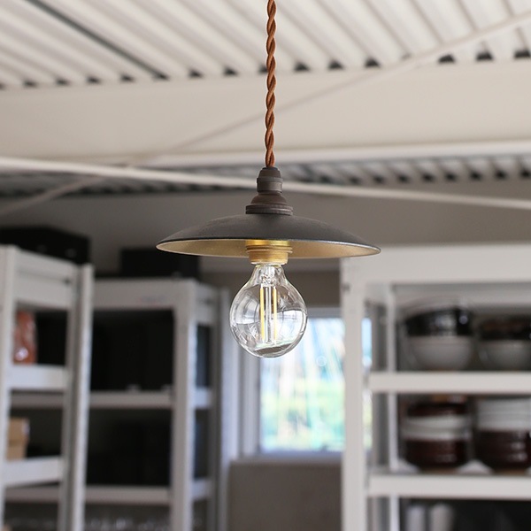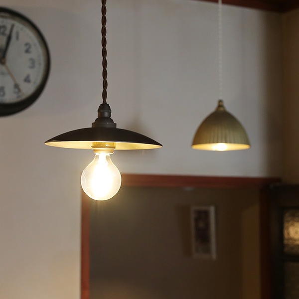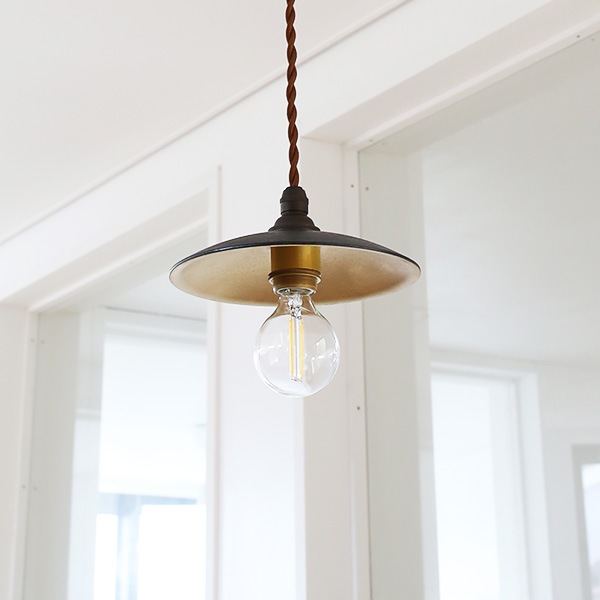FUTAGAMIの真鍮製品は、型から取り出したままの鋳物の表面「鋳肌」をあえてそのままの風合いで残し、真鍮素材ならではの美しさを際立たせています。FUTAGAMI ペンダントランプ 円盤 黒ムラ