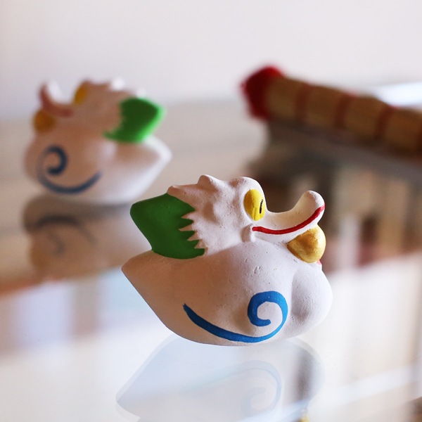 息を吹き入れると「ホーホー」と音が鳴る土笛や、振ると音が鳴る土鈴など、尾崎人形には子どもが喜ぶ仕掛けがたくさん。
