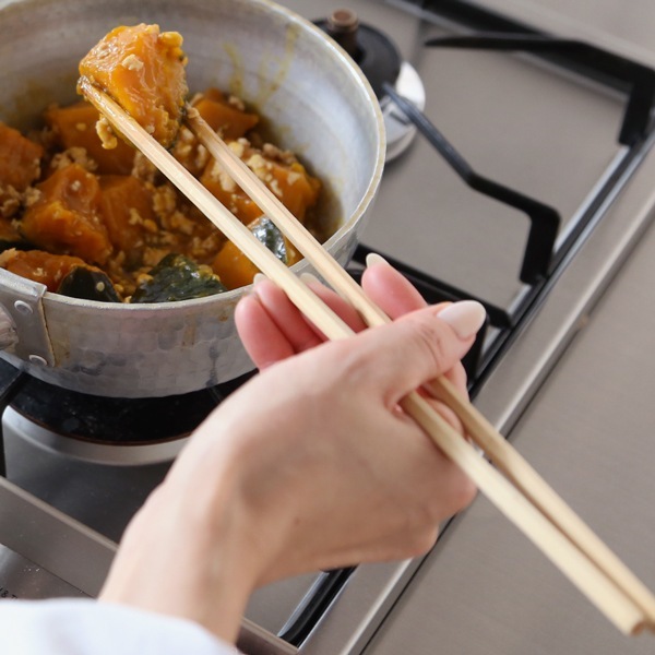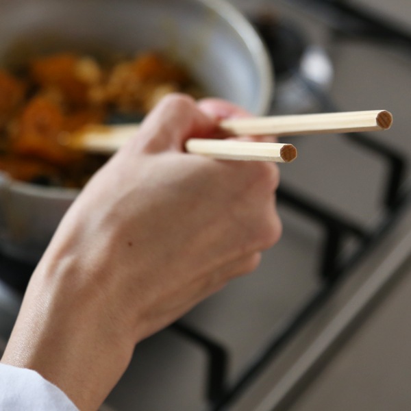 出番や活躍の幅の広い菜箸は、煮る、焼く、炒める、揚げる、混ぜるなど、様々な工程で使われ、扱いやすくタフであることが大切。