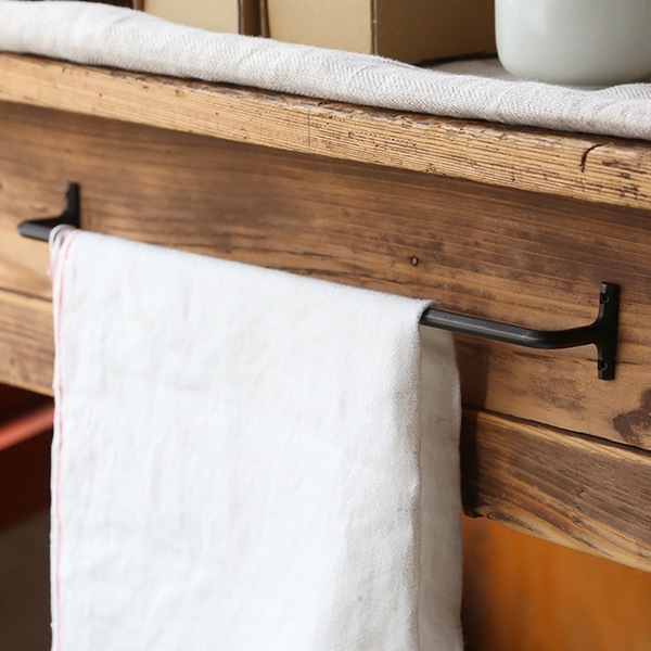 FUTAGAMIの真鍮製品は、型から取り出したままの鋳物の表面「鋳肌」をあえてそのままの風合いで残し、真鍮素材ならではの美しさを際立たせています。FUTAGAMI タオルハンガー 大 黒ムラ