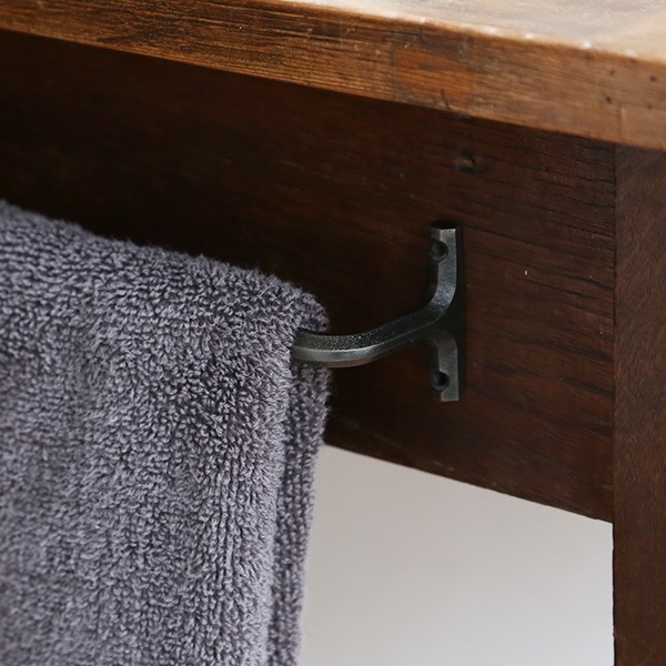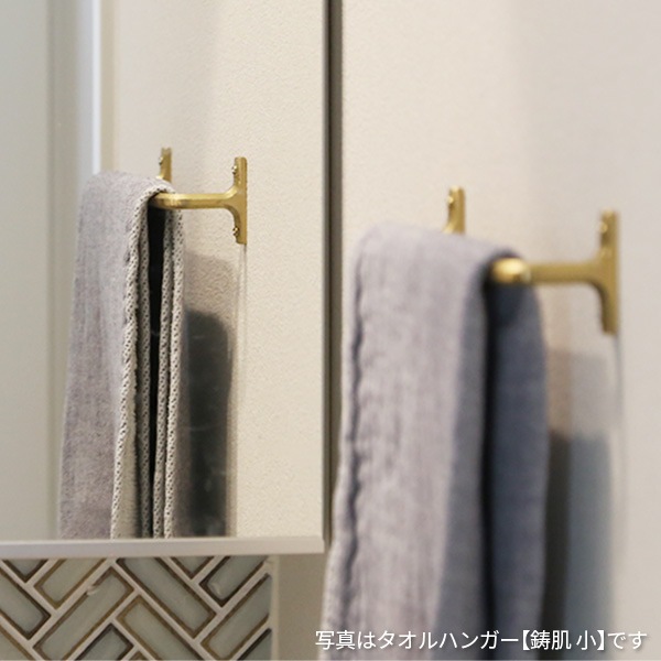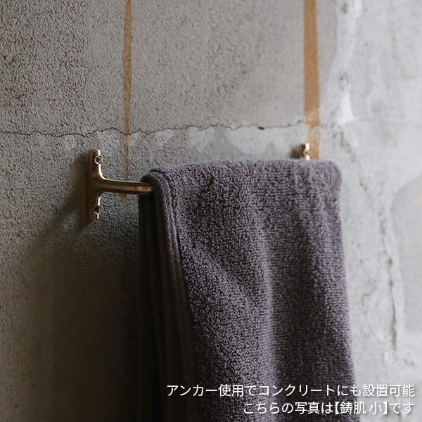 FUTAGAMIの真鍮製品は、型から取り出したままの鋳物の表面「鋳肌」をあえてそのままの風合いで残し、真鍮素材ならではの美しさを際立たせています。FUTAGAMI タオルハンガー 小 黒ムラ
