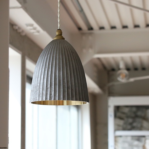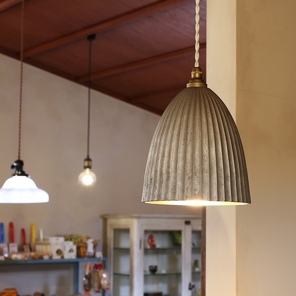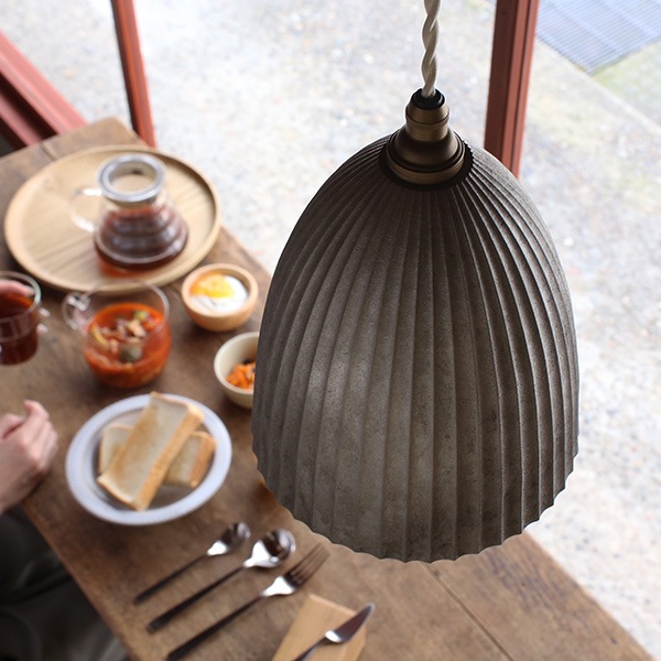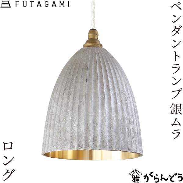 FUTAGAMIの真鍮製品は、型から取り出したままの鋳物の表面「鋳肌」をあえてそのままの風合いで残し、真鍮素材ならではの美しさを際立たせています。FUTAGAMI ペンダントランプ プリーツ ロング 銀ムラ