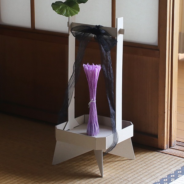 白と紫の和紙で包まれた線香花火は、飾り台に立てかけることで、花火をお供えすることができます。