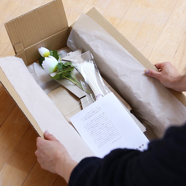 飾り台は紙製でできており、軽く、組み立て簡単。専用のボール箱にまとめられているのでかさばらず、ご進物にもぴったりです。