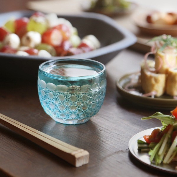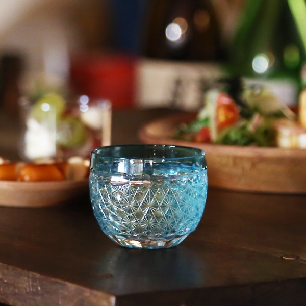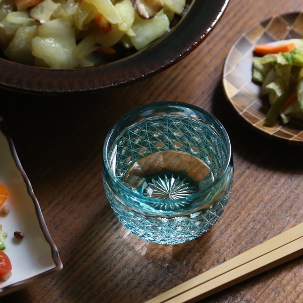 磨きの技術で刻まれた小さな玉を覗くと、菊繋ぎ文様が映り込み、無数の星がキラキラと輝いているよう。繊細な菊繋ぎと小さな玉が生み出す幻想的な風景。ぜひ手のひらの中で実感してもらいたいグラスです。