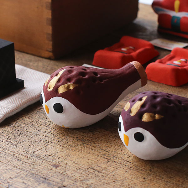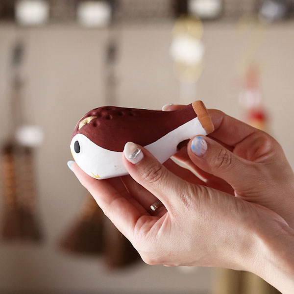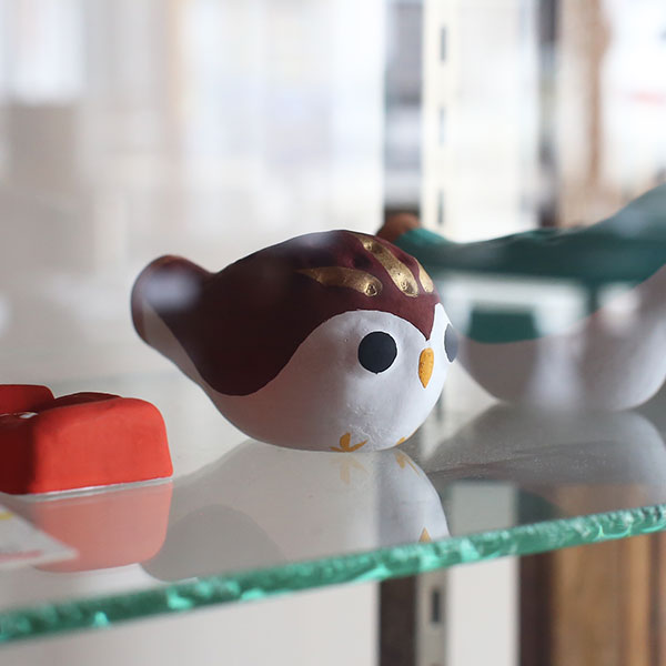 柳屋のフクロウ笛は鳥取県内の協力者により、石膏の型おこしから陶土で笛の製作、彩色をして復刻したもの。シンプルながら心和む姿と音色は、なつかしさを感じさせます。鳥取の郷土玩具を復刻・創作し続けた玩具屋さん