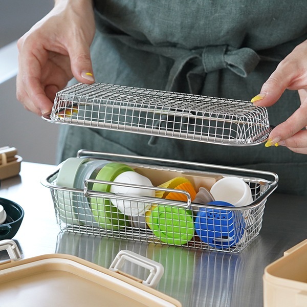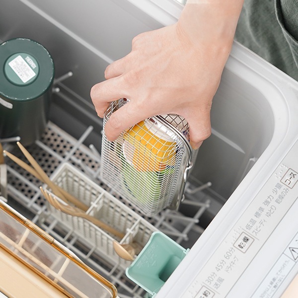 食洗機で洗うときに散らばりがちなマグボトルのフタやパッキン、お弁当用小物を、散らばることなく洗える小物かご。洗い終わりに小物を探す必要がなくなり、家事の手間が少なくなります。