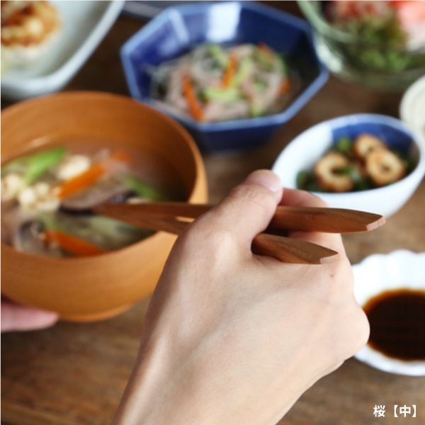 桜【中】 持ち手から先端にかけて丸く削られています。適度な太さがあるので、箸先をコントロールしやすく、食材が摘まみやすいです。
